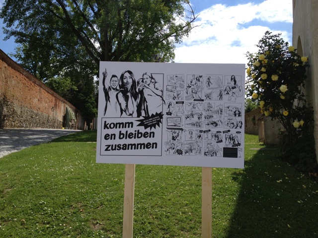 kommen bleiben zusammen, ist ein comic im Rahmen von Kunst im öffentlichen Raum NÖ zur Ausstellung: die 70er – Damals war Zukunft/Schallaburg. Kuratiert von Maren Richter