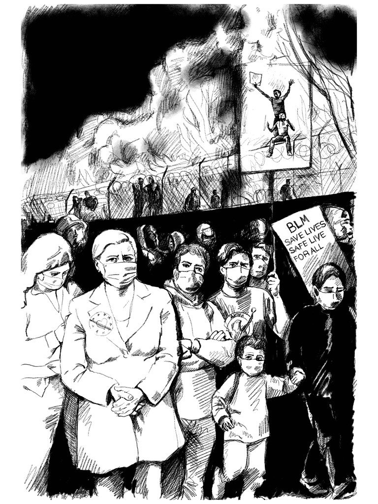 Zeichnungen in der Onlinemagazine movements Journal for Critical Migration and Border Regime Studies. Issue: Covid-19-Pandemie, das Scheitern und den Rassismus der EU Migrations- und Asylpolitiken.